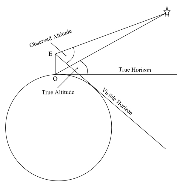 In the diagram, O is an observer’s position on the Earth’s surface and E is the position of his eye. We can see that, as the observer’s height of eye is raised above sea level, his visible horizon ‘dips’ below the true horizon and so the altitude measured at E becomes greater than that measured at O.