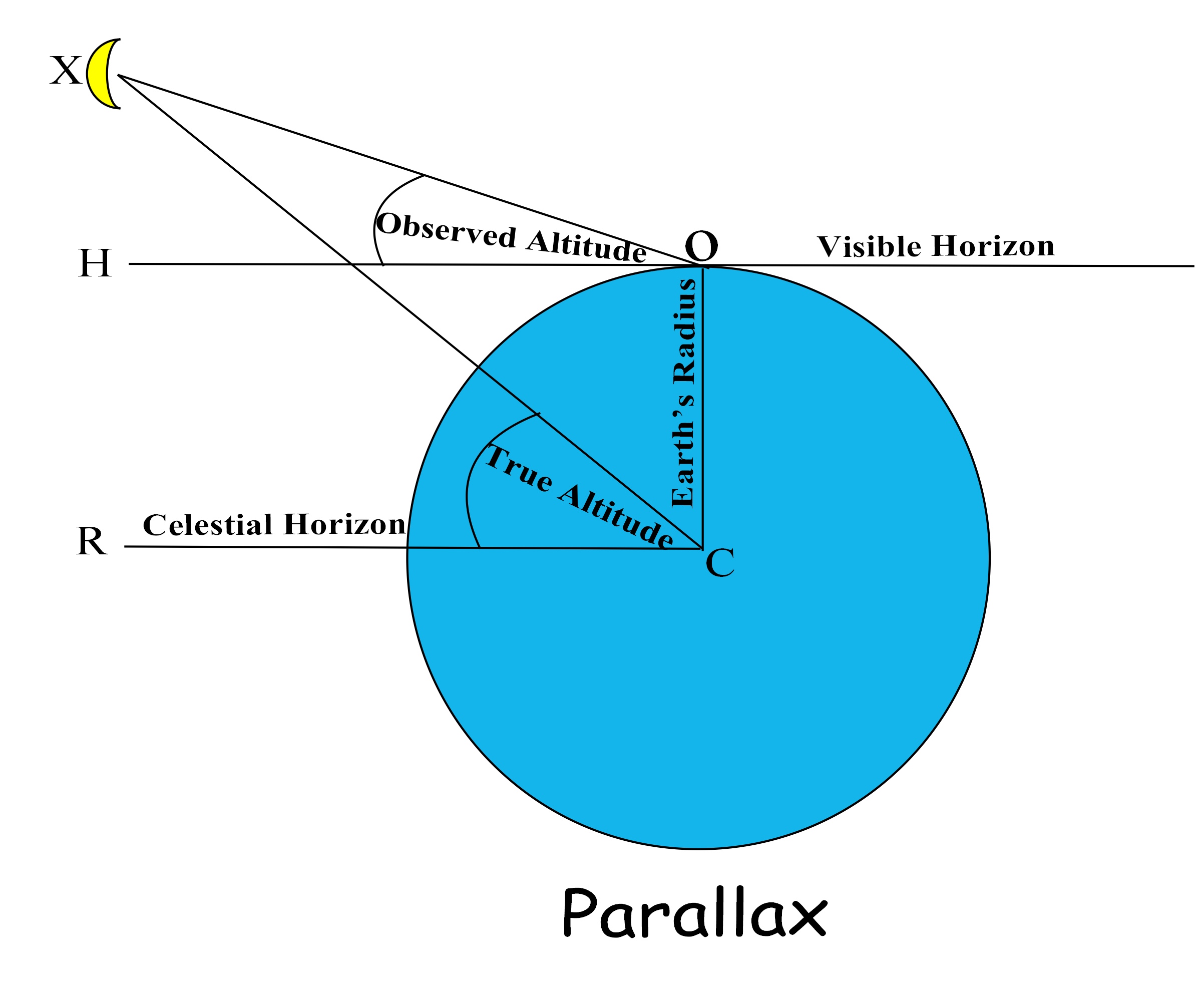 O is the observer’s position and Z is the zenith at that point. OH is the horizon. XOH is the true altitude of the Moon from the observer’s position. However, due to refraction, the celestial body appears to be at Y and so YOH becomes the observed altitude and a correction will have to be made to compensate for this.