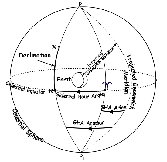 The Sidereal Hour Angle (SHA) is the angular distance from the meridian of the First Point of Aries to the meridian of the celestial body (R) measured westwards.