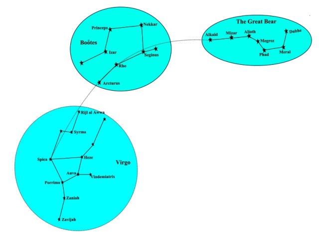 Finding Virgo. As we learned when studying the constellation Boötes, an imaginary curved line from Alkaid in the Great Bear leads to the bright orange star Arcturus, in the constellation Boötes. If, as shown in the following diagram, we continue that curved line by another hand span from Arcturus we will come to the bright bluish-white star Spica in the constellation Virgo.