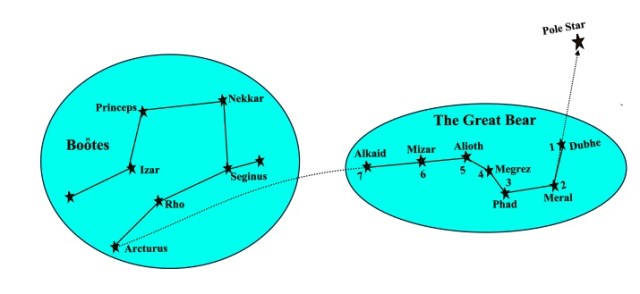 Boötes The Herdsman. If we take a line from Alioth to Alkaid in the Great Bear and extend that line in an imaginary curve for about roughly three hand-spans as shown in the diagram below, it will point to Arcturus, the brightest star in the constellation Boötes.