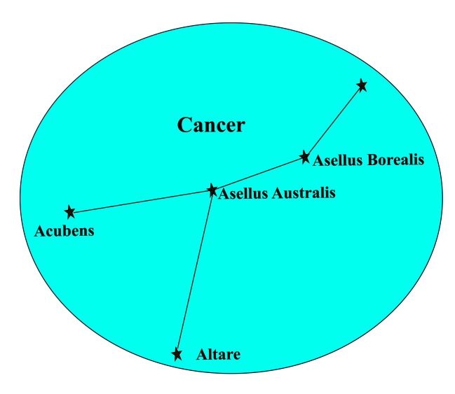 Cancer consists of mainly faint stars, none of which is a navigational star and for this reason, it is not a very useful constellation for astro navigation. However, it does help us in one way: Although astrology has no place in astro navigation, the signs of the zodiac can be very useful to navigators because the order in which they follow one another can tell us the position of one zodiac constellation in the sky with respect to another. For example, we know that Cancer’s position on the ecliptic falls between Leo and Gemini and as the following diagram demonstrates, Cancer can easily be found nestling between those constellations with Gemini lying to the west and Leo to the east (remember that in star maps, east and west are reversed with respect to conventional maps).