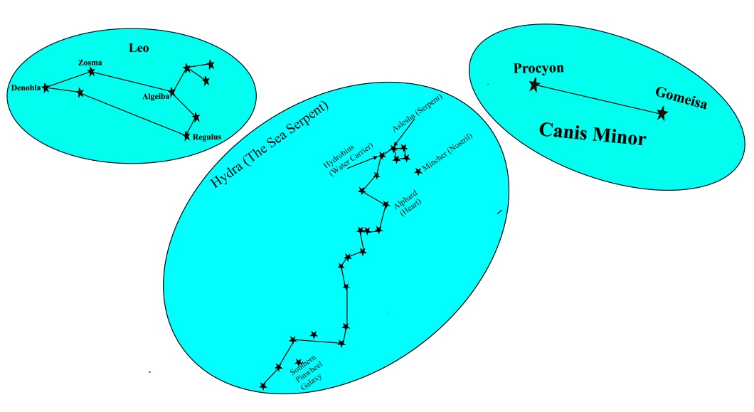 Finding Hydra. Hydra is such a large constellation that it really depends on which part of it you want to see. If you want to see head, then, as the diagram below shows, you should look between the constellations Canis Minor and Leo (look for the bright stars Procyon in Canis Minor and Regulus in Leo). If you the tail, then you should look to the south of Virgo (look for the bright star Spica).