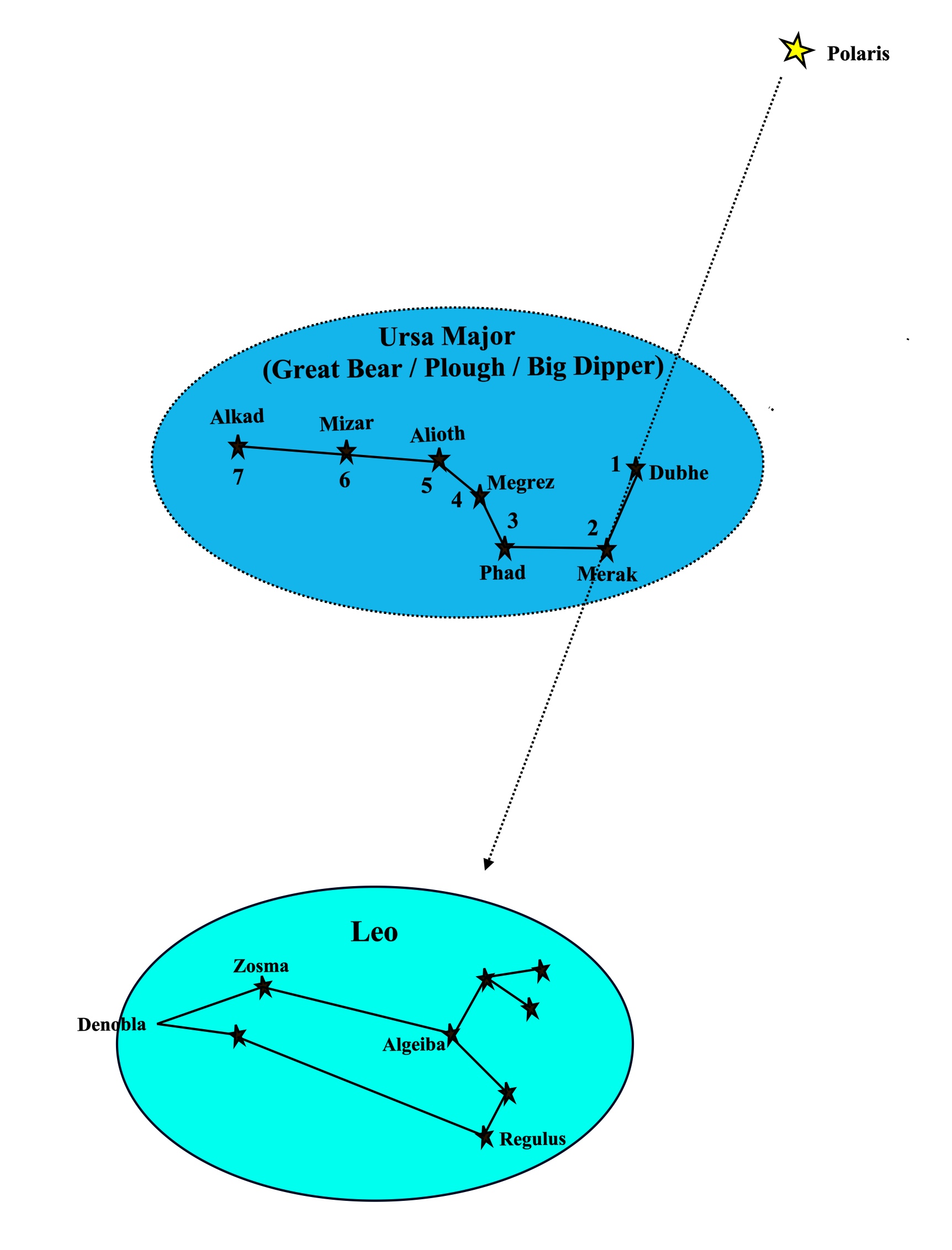 How to find Leo. When the line of pointers in Ursa Major is produced in the opposite direction to the Pole Star, that is from Dubhe to Merak, it will point to Leo as shown in the diagram below.