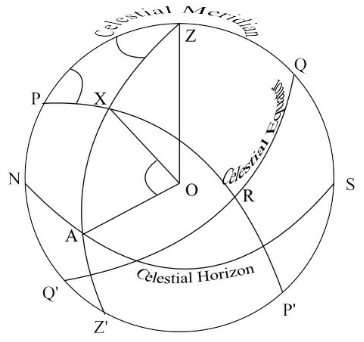 In the diagram below, Z marks the zenith of the observer, X is the position of a celestial body and O is the Earth’s centre.  The zenith distance is the angular distance ZX which is subtended by the angle XOZ .  In other words it is the angular distance from the observer’s zenith to the celestial body.  (For a fuller explanation of zenith distance follow this link:)