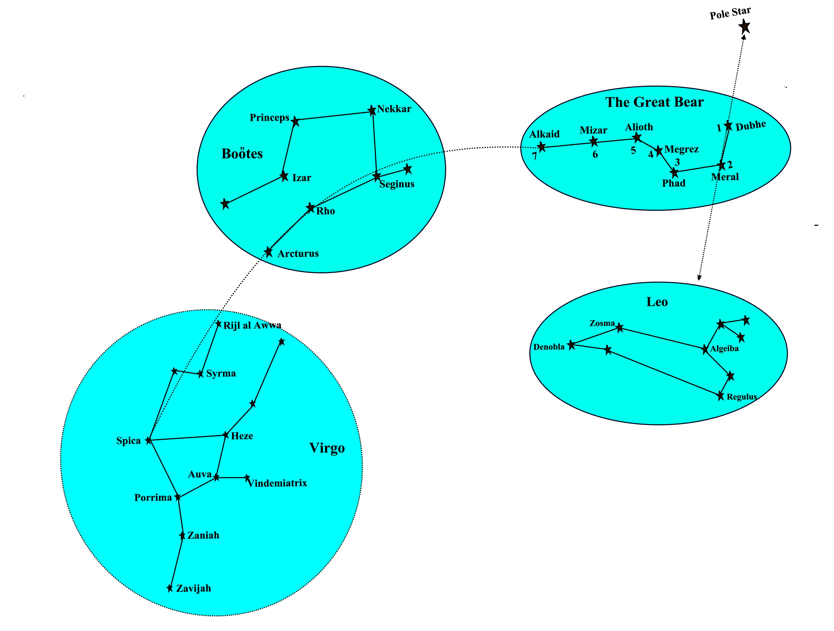 As we learned when studying the constellation Boötes, an imaginary curved line from Alkaid in the Great Bear leads to the bright orange star Arcturus, in the constellation Boötes.  If, as shown in the following diagram, we continue that curved line by another hand span from Arcturus we will come to the bright bluish-white star Spica, in the constellation Virgo which is to the left of Leo.