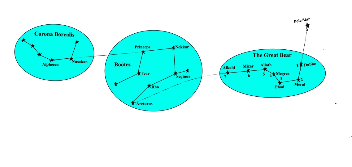Boötes  The Herdsman   If we take a line from Alioth to Alkaid in the Great Bear and extend that line in an -imaginary curve for about roughly three hand-spans as shown in the diagram below, it will point to Arcturus, the brightest star in the constellation Bootes.
