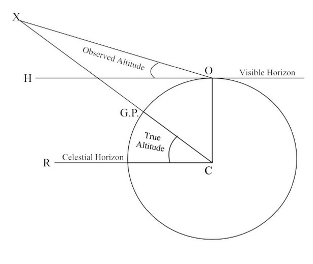 - Fourthly, a sextant is used to measure the angle between the body and the horizon. As shown in the diagram below, the observer measures the altitude in relation to the visible horizon from his position at O on the Earth’s surface. So, the observed altitude is the angle HOX. However, the true altitude is measured from the Earth’s centre in relation to the celestial horizon and is the angle RCX.