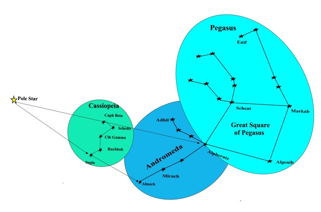As shown in the following diagram, once we have found Andromeda, we will also have found the constellation Pegasus because the star Alpheratz in Andromeda is also included in what astronomers call the ‘The Great Square of Pegasus’.