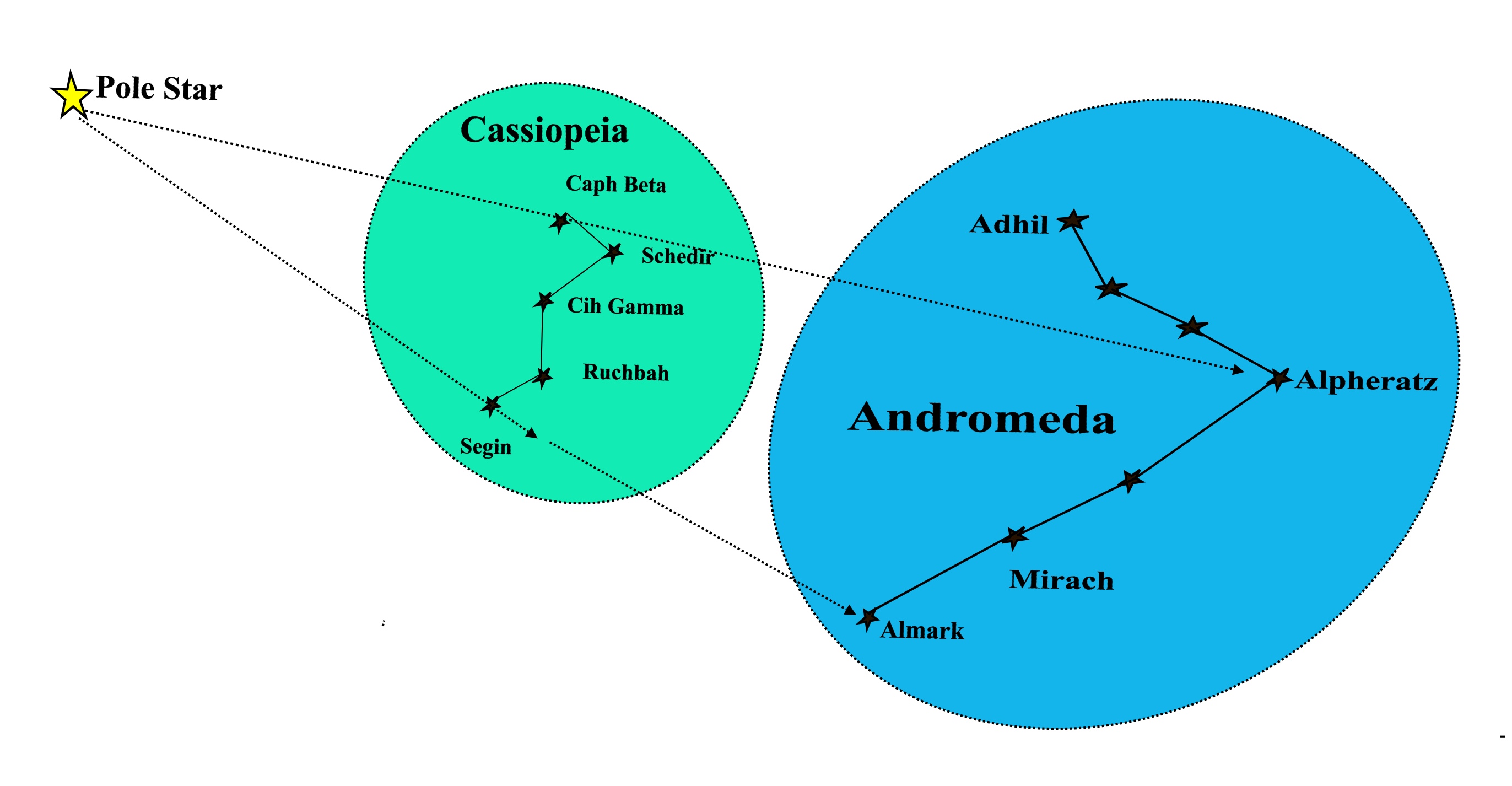 How to find Andromeda. The next diagram shows that, if a line from the Pole Star to Segin in Cassiopeia is extended by about one hand-span, it will point to the star Almark of Andromeda; alternatively, a line from the Pole Star through the star Caph Beta of Cassiopeia will point to Alpharatz in Andromeda. (Note. Cassiopeia is one of the northern hemisphere’s circumpolar constellations which we discussed in part 3 of this series).
