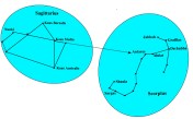 In ancient Greek mythology, Sagittarius was said to represent the Archer, a beast called a Centaur which was half man and half horse.  In the representation below, the Archer has a drawn bow with the arrow pointing to the star Antares, the heart of the scorpion, which had been sent to kill Orion.